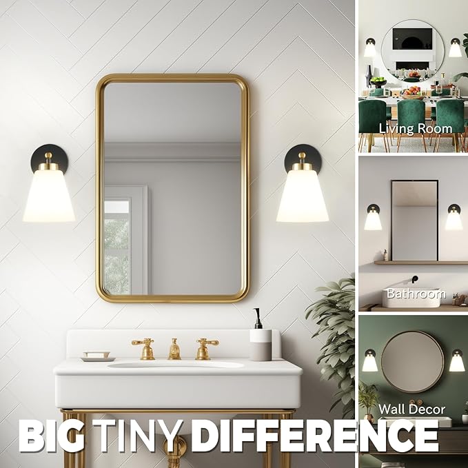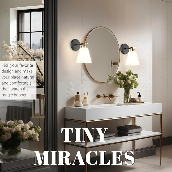 - 🦁【Quality and Durability】 Equipped with sturdy die-cast metal, you do not have to worry about aging, bent or color fading problems of this black and brass vanity sconce lighting fixture. The detailed power coating enhanced water-proof function to make it anti-rust. Working in moisture damp locations over decades is not a big problem. The wall sconce shades are made of tempered thickened strengthened frosted glass which is not easy to break up and brighten up your abode with intention.