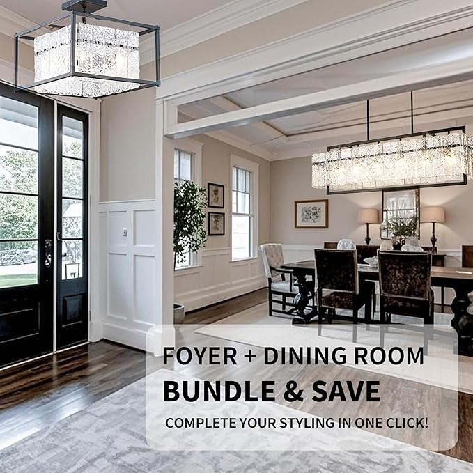 IKK Modern Foyer Chandelier, Black Crystal Chandelier for Dining Room, Square Entryway Light Fixture Hanging, Easily Adjustable Height Glass Chandeliers for Kitchen Island, Elegant Water Ripple