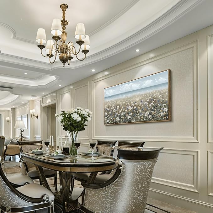 - ➤Bring a Beach Vibe to Your Space: This large floral wall art depicts a seashore covered with newly blooming wildflowers Daisy. The upper half of the canvas wall art features a blue sky and a calm ocean in pale blue and gray tones for a fresh and breezy look. The lower half of the artwork is covered in a neutral palette of white, cream, and brown to complete this coastal farmhouse piece.