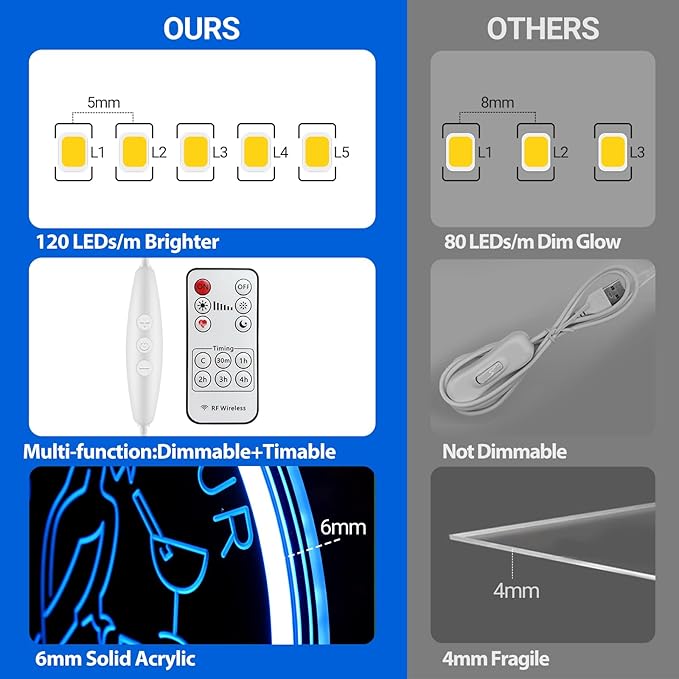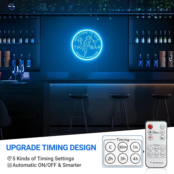 - â°ăOriginal Timing FunctionăThe tiki bar neon light adopts the latest timing control design with 5 timing modes of 0.5 H/1 H/2 H/3 H/4 H. It also has stepless dimmable mode and multiple dimming modes. You can arbitrarily adjust the brightness and set the mood for any occasion, whether it's a romantic bistro, a party, or just relaxing at home. More convenient & save energy.