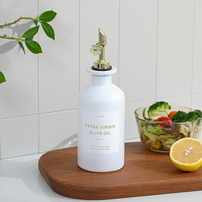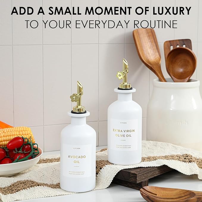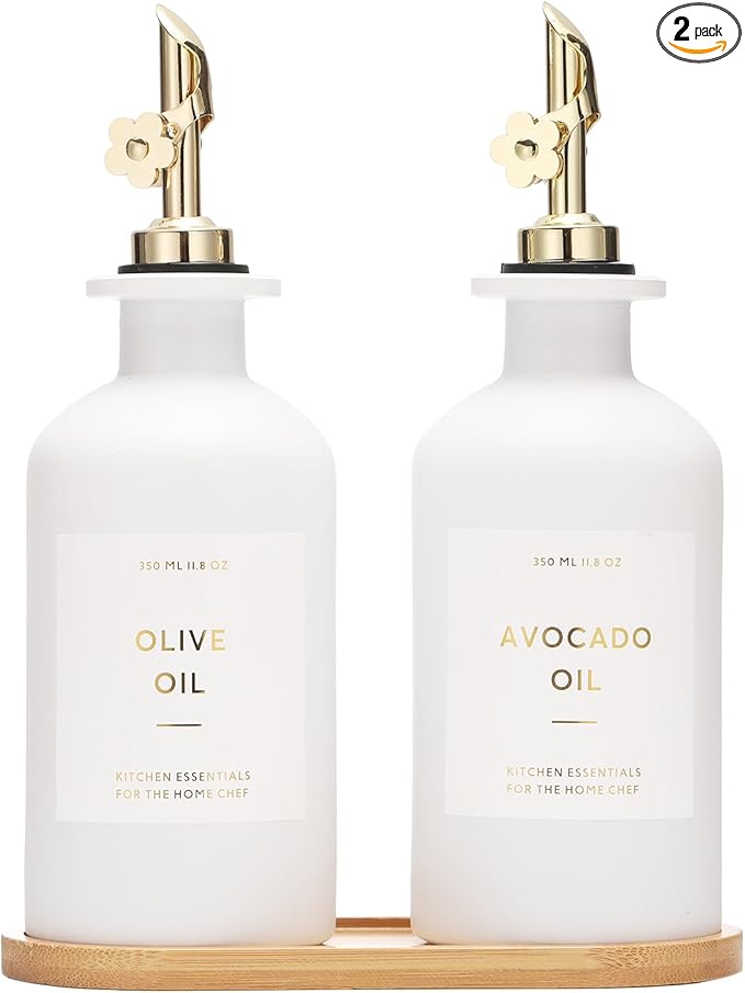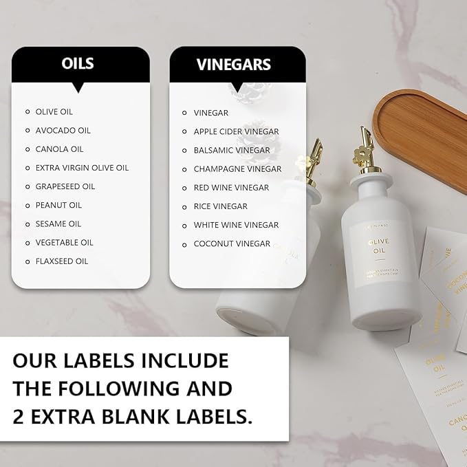 - KITCHEN OLIVE OIL DISPENSER BOTTLES – The oil and vinegar dispenser set contains 2 white 11.8oz (350ML) glass bottles, 2 gold stainless steel oil spouts, 17 waterproof labels(kinds of oil and vinegar) and a bamboo tray, Ideal for safely store and dispense your olive oil and vinegar.