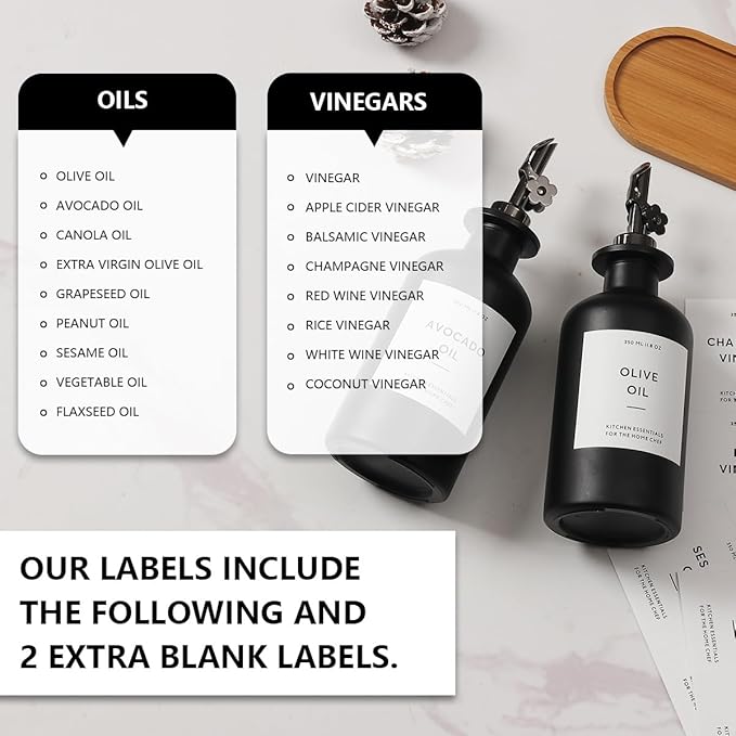 - KITCHEN ESSENTIAL - Worthy of sitting on your kitchen counter, The olive oil bottle dispenser for kitchen with label which can help you identify them easily, both decorative and practical, this oil dispenser bottles not only kitchen oil dispenser, but also black and white kitchen décor.