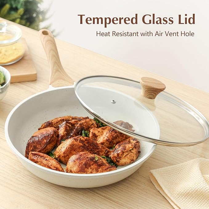 - HEAT RESISTANT HANDLE AND TEMPERED GLASS LID - The bakelite handle of the non toxic fying pan skillet with lid features woodgrain design, and it is comfortable to grip and stays cool while cooking. The tempered glass lid can prevent the oil from splashing onto your stovetop.