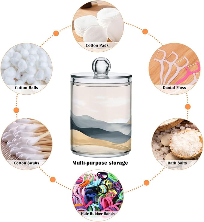 - EASY TO USE - As excellent bathroom accessories, you can easily open this storage canister with one hand. You can use these storage containers for organizing small items and keeping them neat and clean. Such as cotton balls, cotton swabs, cotton pads, beauty eggs, face brushes, floss picks, hair ties, bath salt, pens, clips, and more