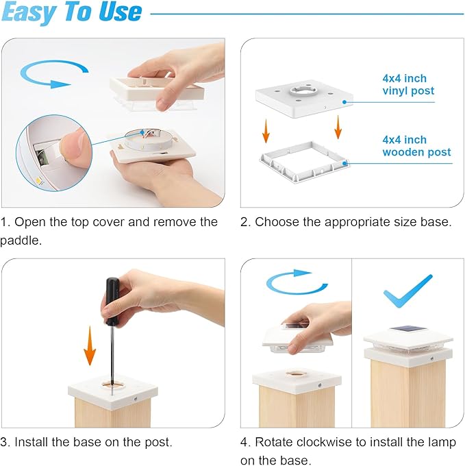- 【Easy Installation】Each package contains 2 bases (4x4 wooden post and 4x4 vinyl post) and 12 screws. Choose the appropriate base size and place it on the corresponding post, then screw the two screws into the post through the small holes on both sides of the base. The solar fence post cap light is charged in sunlight for 6-8 hours during the day and automatically turns on for 10-12 hours at night