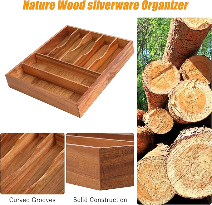 - ✅【Perfect premium bamboo】Our utensil silverware drawer organizer flatware cutlery tray is crafted from natural bamboo that has been grown for over 4 years. Each silverware drawer organizer made of bamboo is meticulously handcrafted by seasoned artisans to ensure a smooth, splinter-free surface. You can confidently allow your family or children to use our silverware drawer organizer. Unlike plastic and metal drawer organizers, our utensil holder is water-resistant and odor-resistant, making it perfect for long-term use.