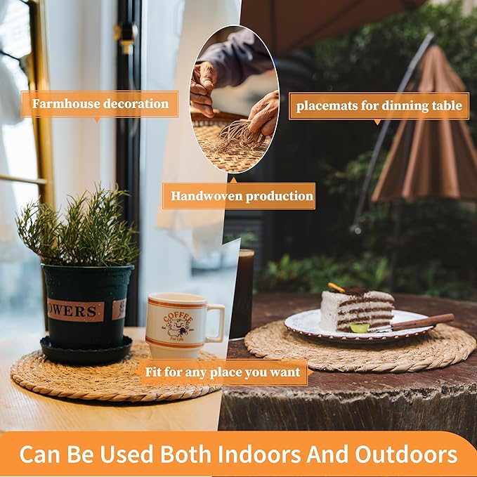 - 【Protection &Heat Resistant】:Defined Deco woven placemats are 11.8 inch in diameter, Made of 100% natural water hyacinth, friendly to kids, the elderly or pregnant women, compact and rigorous weaving provide durable quality and soft touch.Our braided circle placemats are hand-woven and more heat resistance than other straw mats, cloth mats and rubber pads.