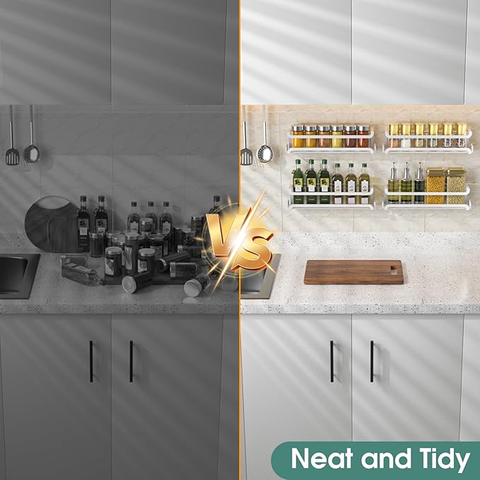 - Stable Guardrail & Wider Adhesive Stickers - Our spice rack organizer for cabinet door added side guards and improved two-in-one wider adhesive stickers for increased safety and stability. The adhesive spice racks have guard rails prevent spice from falling, while the wider and stronger stickers provide extra protection and peace of mind in your busy kitchen