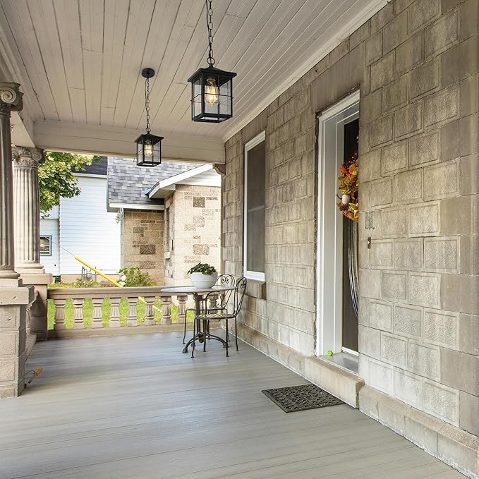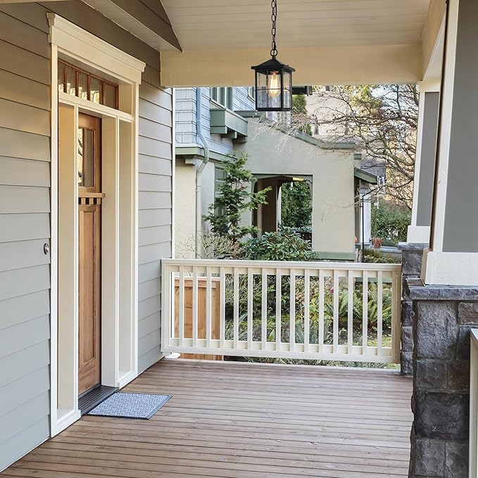 - Timeless Elegance Meets Robust Durability: Enhance your farmhouse exterior with our Charming Outdoor Pendant Light. Featuring intricate cross bars, a sophisticated stepped design, and clear seeded glass panels, this fixture in matte black finish creates a stunning focal point. Illuminate your surroundings with style and grace, combining robust construction with timeless beauty.