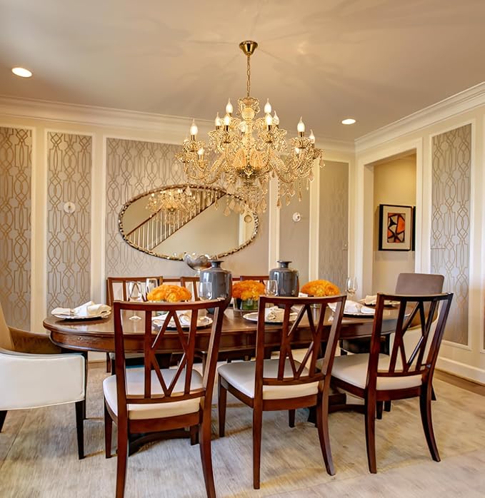 - This is a modern and luxurious golden transparent crystal chandelier with candle style 15 lamp arms, and over 90% of the entire lighting accessories are made of crystal. When the light comes on, the entire crystal shines brightly, showcasing modern luxury and bringing a luxurious and warm style to your home.