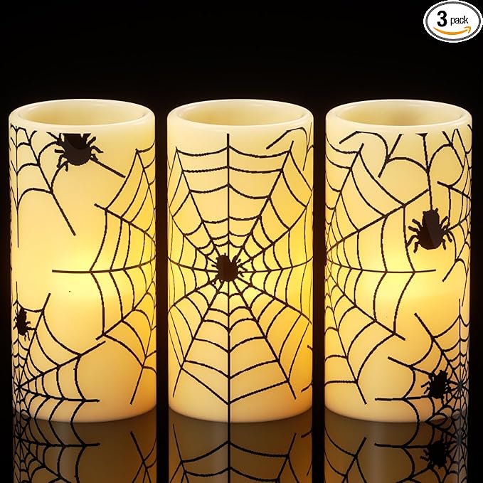 - Creative Spider Decals: Three flameless candles with three different spider decals, real wax flickering candles add horror and creepy atmosphere for Halloween home party decoration. Just light up your Halloween day.
