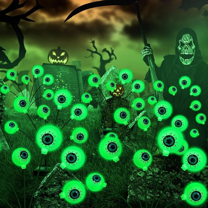 - 【SCARY HALLOWEEN DECOR】 3D design and swaying eyeball make the lights more three-dimensional and realistic. The bloodshot eyes are perfectly combined with the green lights, easily create a spooky atmosphere. Use this swaying eyeball lights to light up your Halloween, Scare your neighbors and passersby!