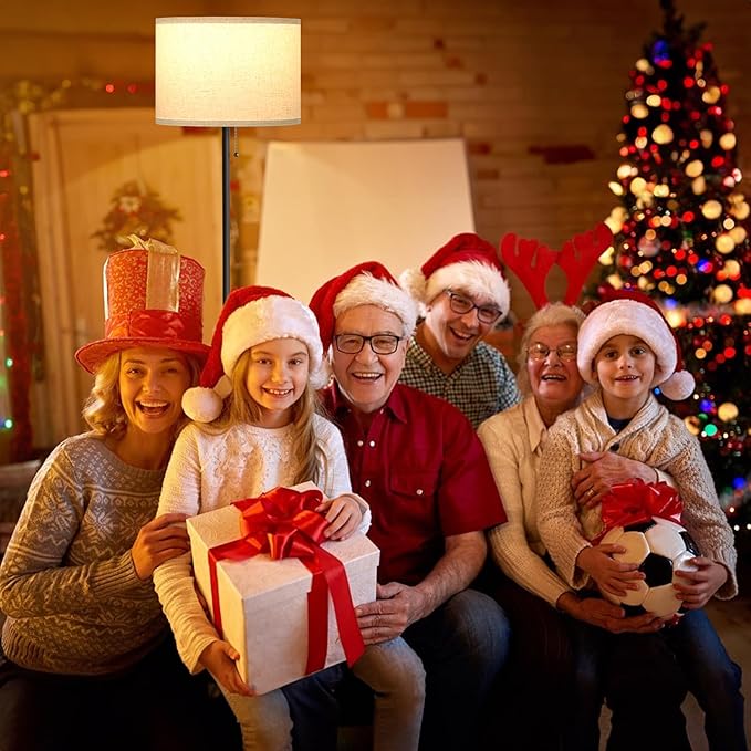 Ambimall Modern Standing Floor Lamp for Living Room & Bedroom with 3 Color Temperatures Bulb & Pull Chain Switch, 60" Tall with Beige Shade & Black Pole