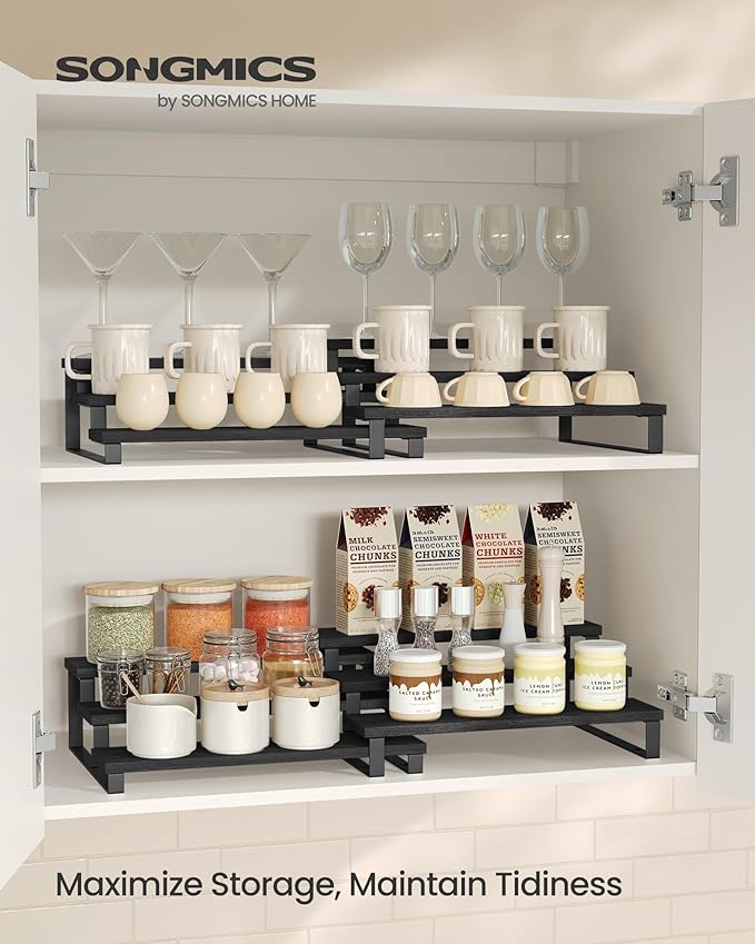 SONGMICS Display Risers, Set of 2 Engineered Wood Perfume Organizer Stand, 3-Tier Cupcake Stand Holder, Spice Rack, Shelf Risers for Figures, Dessert Shelves, Ebony Black and Ink Black UKCS116B01