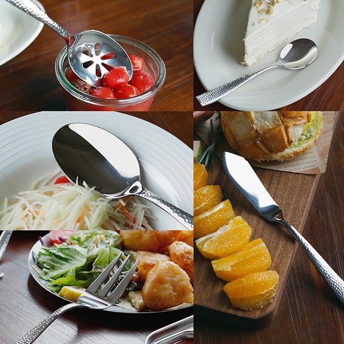 - 【APPEARANCE AND DESIGN】Classic silver color and mirror polish, unique design with hammered handle, dishwasher safe