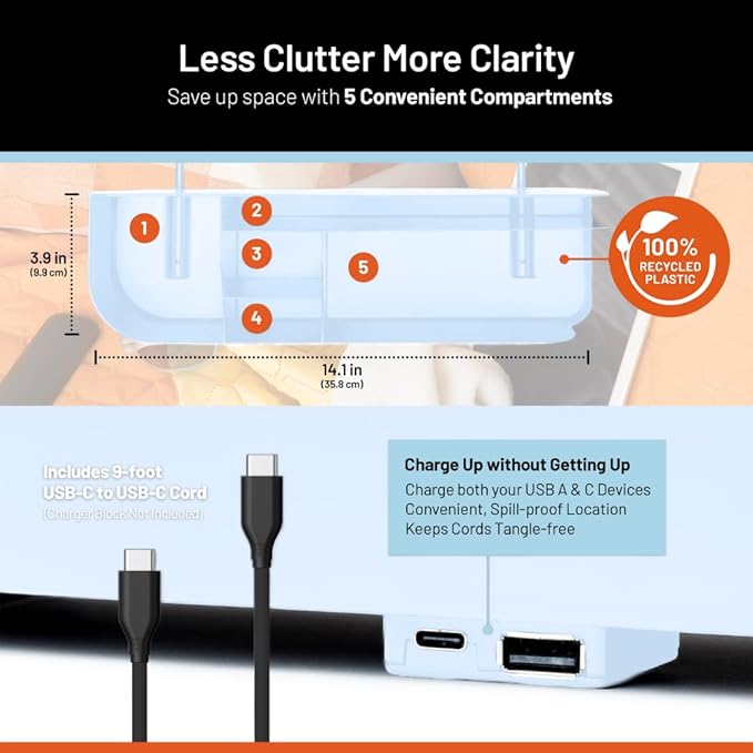 - ONLY CADDY WITH USB-C & USB-A PORTS: No more stretching for far-away devices! Our two built-in charging ports for USB-C and USB-A iPhone, Android, & other devices keep your electronics fully charged and always in grabbing distance. Wall charger block sold separately. For optimal results and faster charging, use an Apple or Android branded wall block.