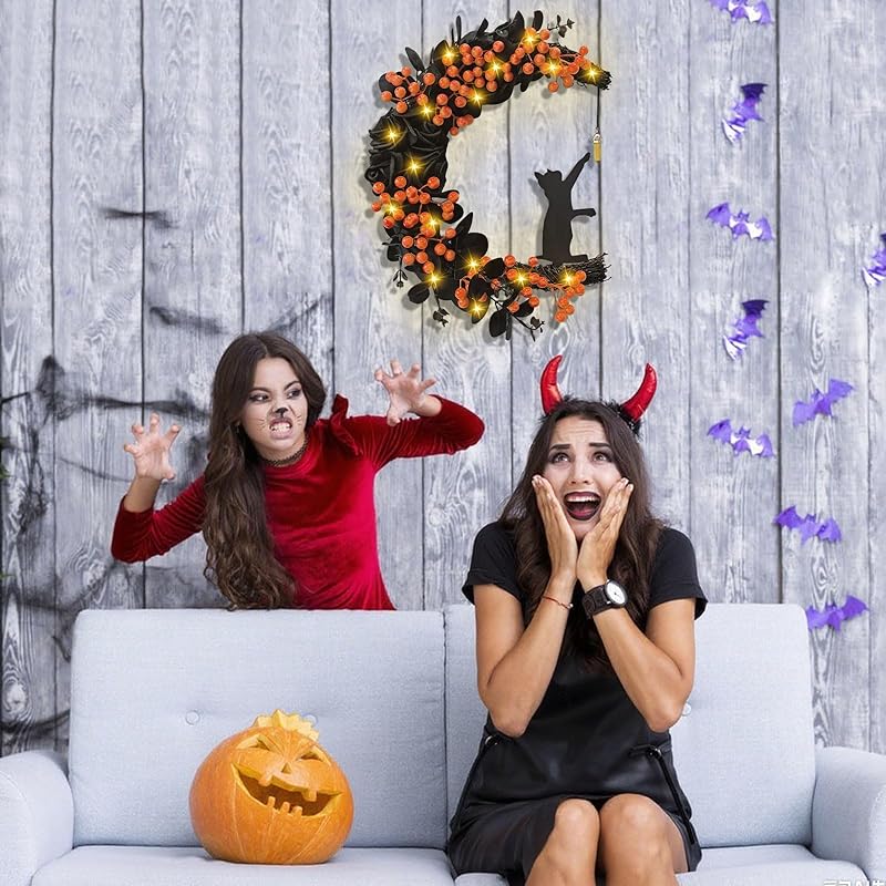 Halloween Wreaths for Front Door with Light, Black Cat Crescent Moon Wreath, Cute Cat Garland Halloween Door Decorations for Outdoor Indoor Decor Wall Window Home Party