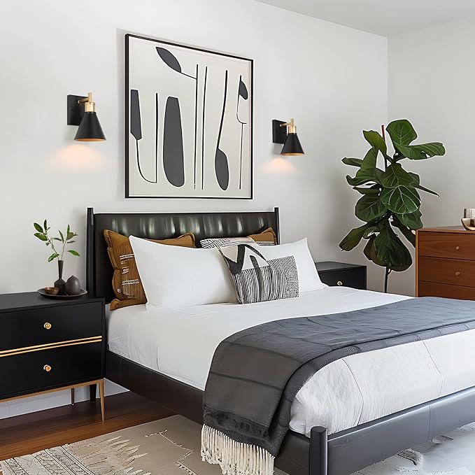 - Black Gold Wall Sconce: This black & gold wall sconce features a sleek black conical metal shade with a contrasting gold interior and accents. Its modern design adds a touch of elegance and sophistication to any room, providing focused, warm lighting ideal for bathrooms, bedrooms, hallways, or living spaces.