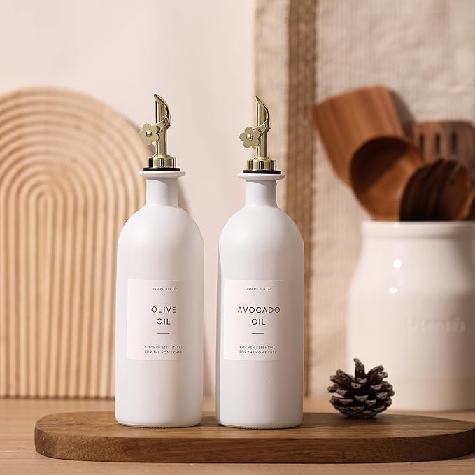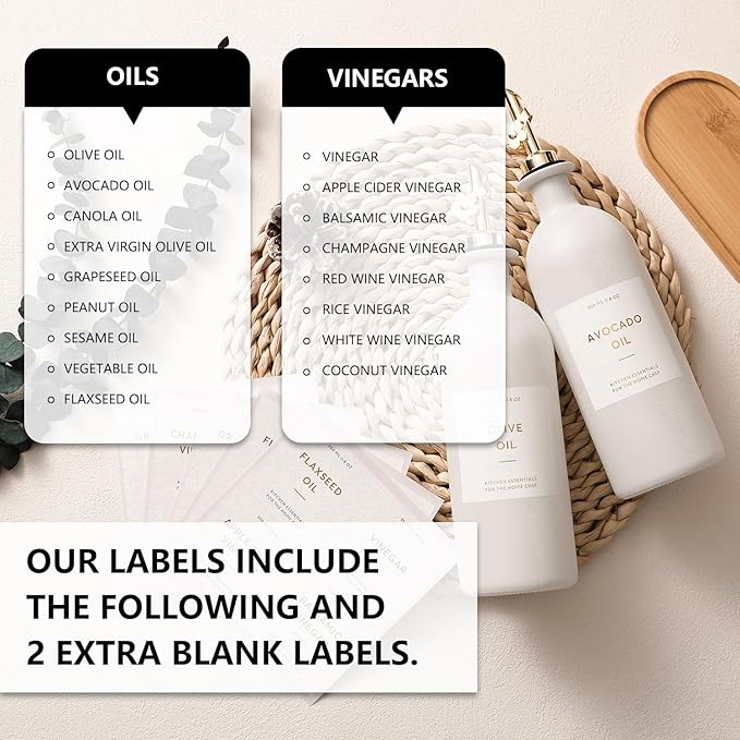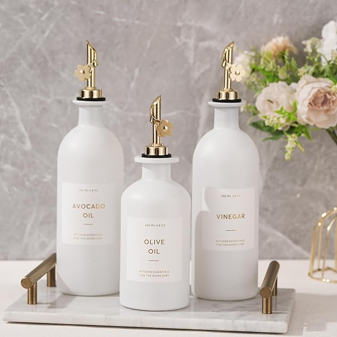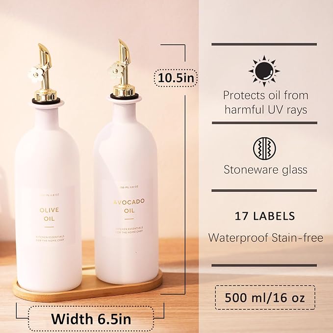 - KITCHEN OLIVE OIL DISPENSER BOTTLES – The oil and vinegar dispenser set contains 2 white 16oz (500ML) glass bottles, 2 gold stainless steel oil spouts, 17 waterproof labels(kinds of oil and vinegar) and a bamboo tray, Ideal for safely store and dispense your olive oil and vinegar.