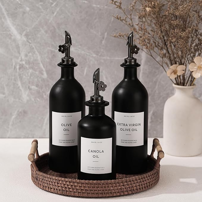 - KITCHEN ESSENTIAL - Worthy of sitting on your kitchen counter, The oil bottle for kitchen with label which can help you identify them easily, both decorative and practical, this cooking oil dispenser not only kitchen oil dispenser bottle, but also black and white kitchen décor.