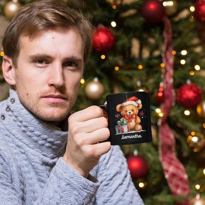 - ๐ UNIQUE DESIGN MUG: Spread holiday cheer with this "Custom Name Xmas Teddy Bear Cup" featuring a cute teddy bear in a Santa hat beside a festive gift. Click "Customize Now" to add a name, making it a personalized gift for the holiday season. This black ceramic mug is ideal for enjoying warm winter drinks in a cozy setting.