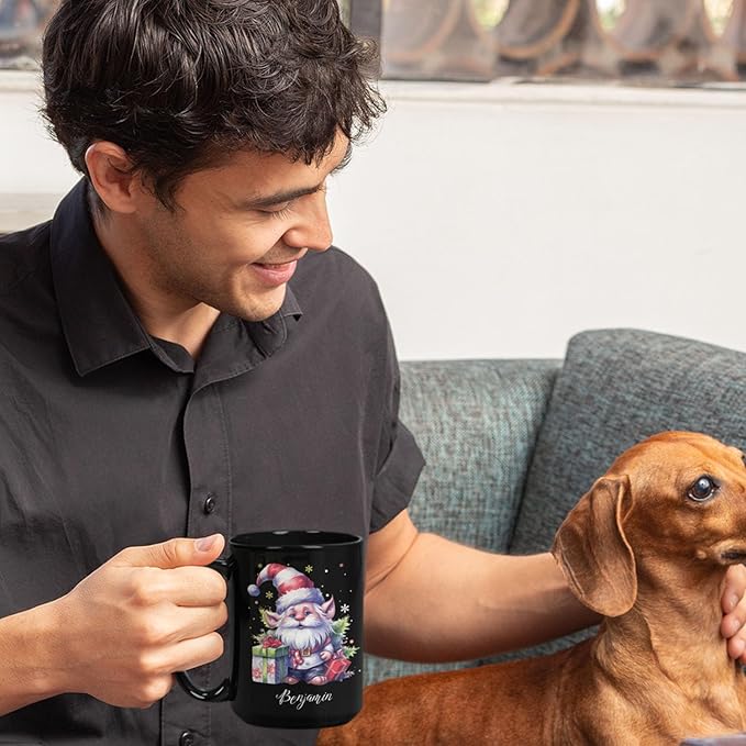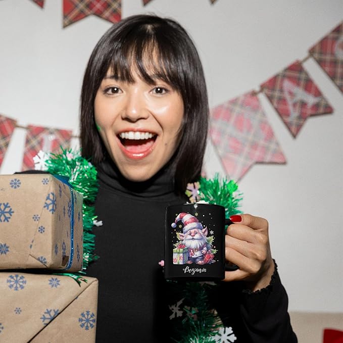 - ๐ UNIQUE DESIGN MUG: Add some festive fun to your holidays with this "Cute Gnome And Gifts Design Mug" featuring an adorable gnome holding gifts. Click "Customize Now" to add a name, making it a great personalized gift for gnome lovers. This black ceramic mug is ideal for enjoying drinks during the Christmas season.