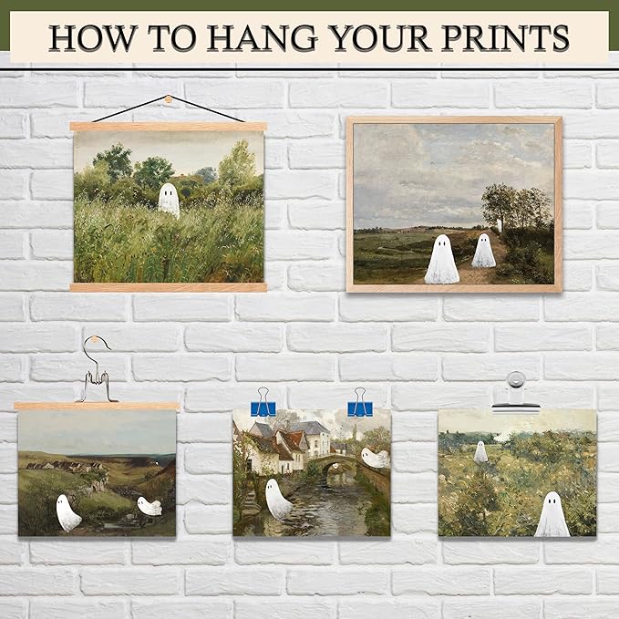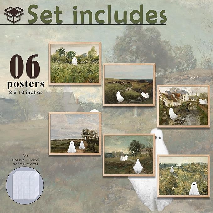 - Ghost Decor: Explore our captivating "Ghost Wall Art" collection of 6 Pcs 8x10-inch. These eerily stunning works of art embrace the aesthetics of dark academia, lending an air of mystery and elegance to your space.