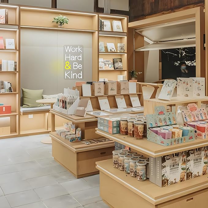 - Work Hard&Be Kind Neon Sign:Be kind neon signs is an inspirational phrase “work hard&be kind”. White letter neon sign lights up the space and is very motivating.