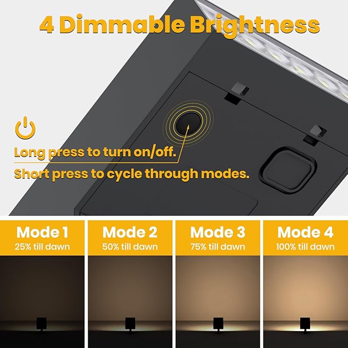 - Dimmable Solar Light: With 4 adjustable brightness levels, this solar outdoor lights allow you to set the perfect mood and visibility for your outdoor space. Product Dimensions: 5.11"L x 3.35"W x 1.12"T