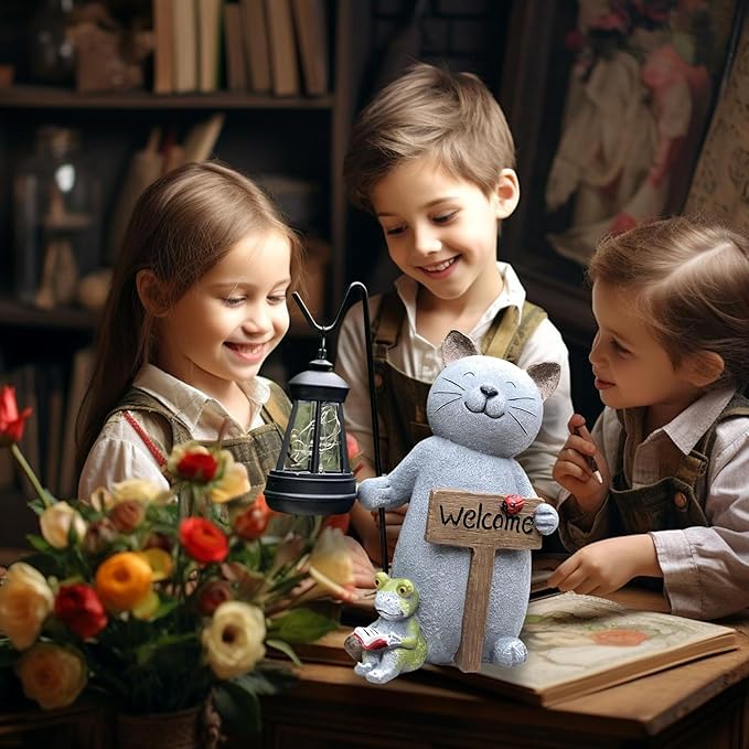 - 【Cute Cat Garden Statues】Solar Outdoor Cat Figurines with Solar Lights Lantern and with a welcome sign,complete with a lifelike expression,cute and intricately designed, is definitely a cute addition to any garden space or lawn decoration.Solar Garden Statue Lights Cat Figurine with Solar Lantern is a cute garden decor good for year round enjoyment.