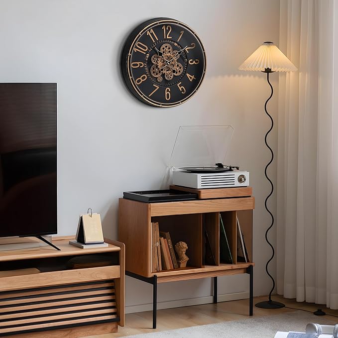 - [Gear Clock with Moving Gears] The centerpiece of this clock is a set of gears designed solely for their visual appeal,creating a dynamic focal point.Industrial style wall clock decor, when you put batteries in, various exposed cog start rotating, definitely an eye-catching gears wall clock for your home, surely capture anyone's attention.