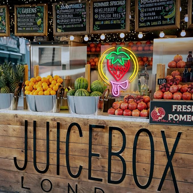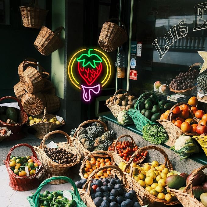 - Straw Light Decoration: The bright and colorful strawberry neon signs are a creative design that combines sweetness and deliciousness, emitting a sweet and warm glow that is eye-catching and suitable for home space decoration, fruit supermarkets, dessert shops, farms, restaurant sign decoration, and warm atmosphere