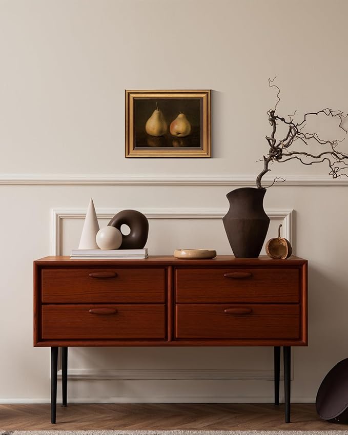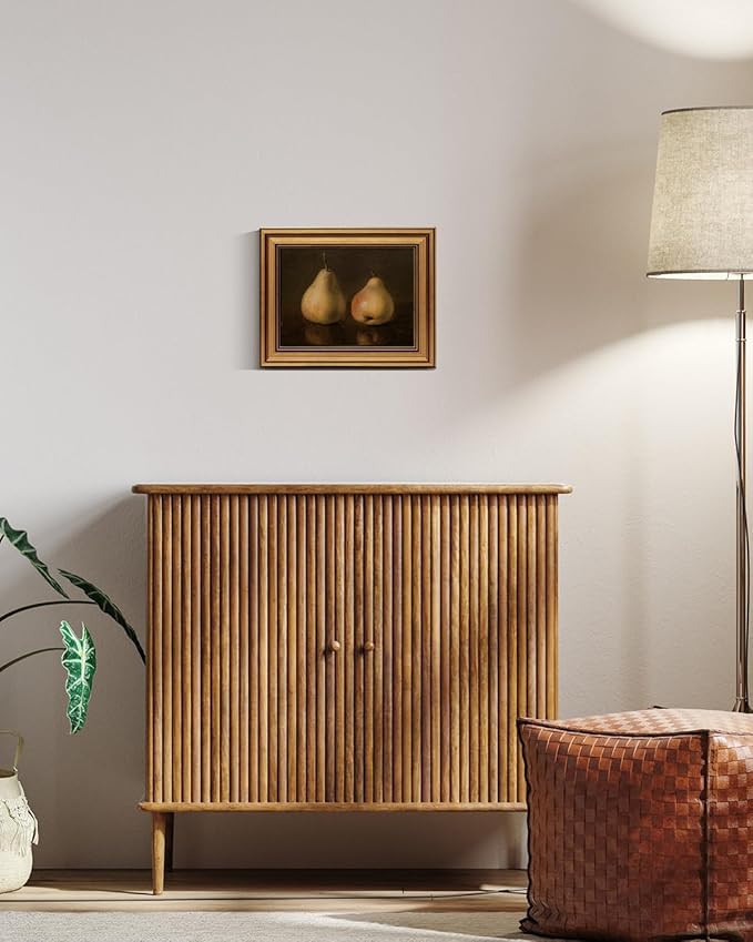 - CLASSICAL ROOM DECOR: Vintage Still Life Pear painting, this wall art picture print utilizes the classic chiaroscuro technique. The two pears, gently leaning toward each other, symbolize a sense of companionship—whether familial, friendly, or romantic. Or abundance, life, and family. The detailed rendering of the fruit’s delicate blemishes and organic imperfections lends an authentic, timeworn charm to the artwork. Inviting viewers to reflect on the beauty of simplicity and everyday life