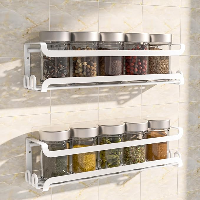 LUCYCAZ 2 Pack Wall Mounted Spice Rack with 16 Hooks, Spice Organizer Shelf for Stove Cabinet Pantry Door,Screw or Adhesive Spice Shelf Hanging Wall Spice Rack in Kitchen and RV (White, 2 PACK)