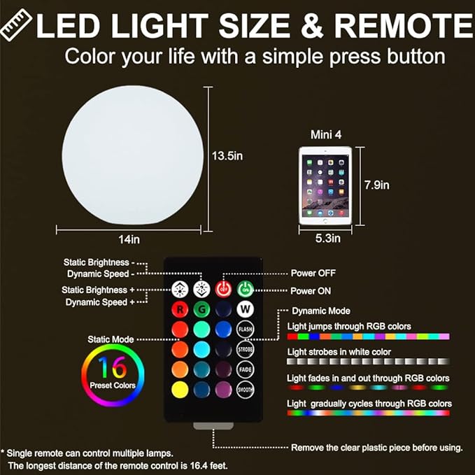 - Multi Color Changing Orb Light: KEROVI glowing ball light has 16 RGB colors, 4 dynamic effect & 8 brightness level, different lighting and colour changes create a different and cheerful atmosphere, add color to your life with the simple press of the remote control or manual switch