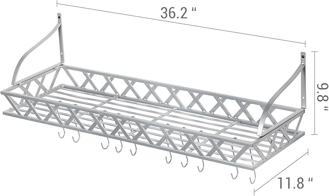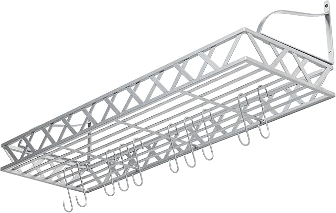 - Made from durable silver-tone metal, this rack offers reliable support for your cookware collection. Its industrial-grade strength ensures it can handle the weight of multiple pots, pans, and kitchen accessories without bending or sagging.