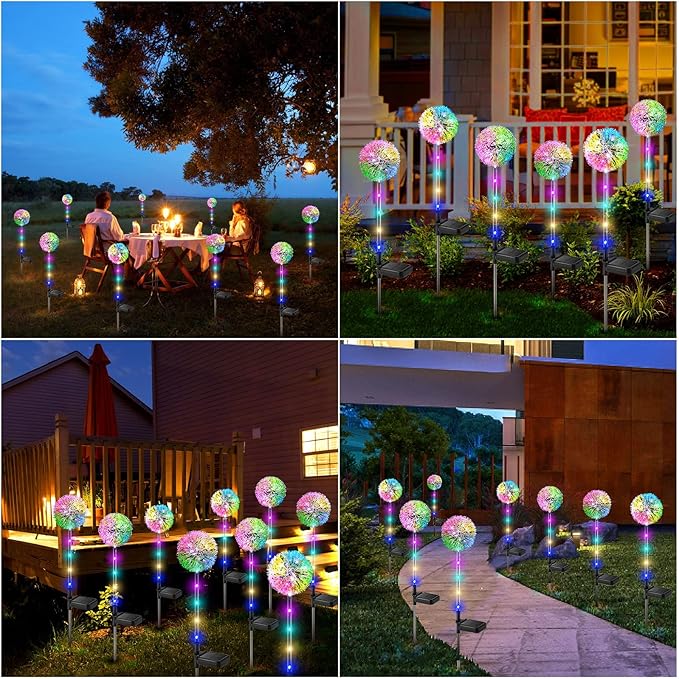 - 6 PACK NEW VERSION SOLAR GARDEN LIGHTS: We listened to the suggestions of many customers, from a single lighting mode solar garden lights to the new version two modes (Constant light & Flicker). The solar dandelion garden lights with multi-color 96 Led ( total) string lights bring bright & colorful glow at night which can be pretty decorations for garden, yard, pathway, pool, riverbed etc, also as amazing gifts choice for family and friends, especially mother's day gift ideas for mom and grandma
