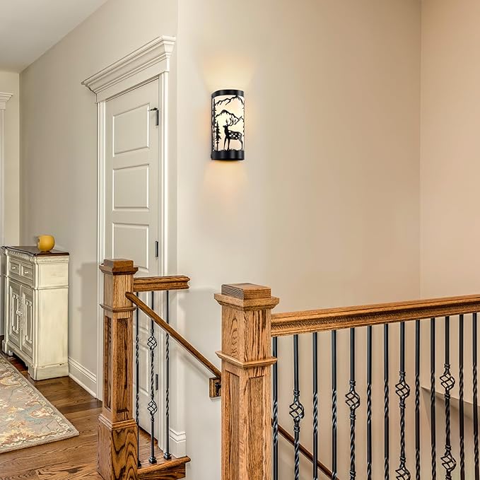 - Rustic Design: Farmhouse wall sconces set of two is crafted from durable matte black metal,featuring intricate forest elements and a deer silhouette,white parchment paper adds a soft,warm glow,enhancing industrial aesthetic of the vintage wall sconce