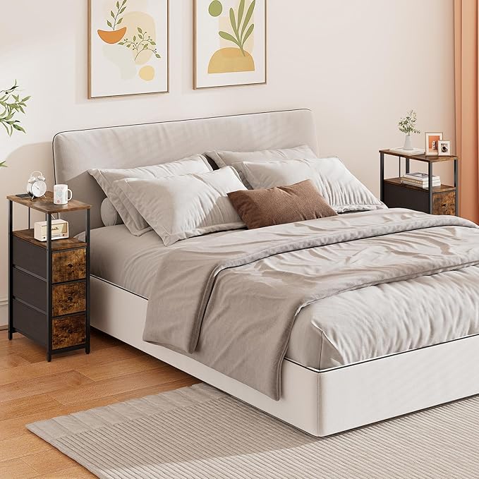 TUTOTAK Narrow Night Stand with Charging Station, Slim End Table with Plugins, Tall Side Table with 3 Fabric Drawer, Small Bedside Table with Storage, Set of 2, Living Room, Bedroom, Brown TB01BB073