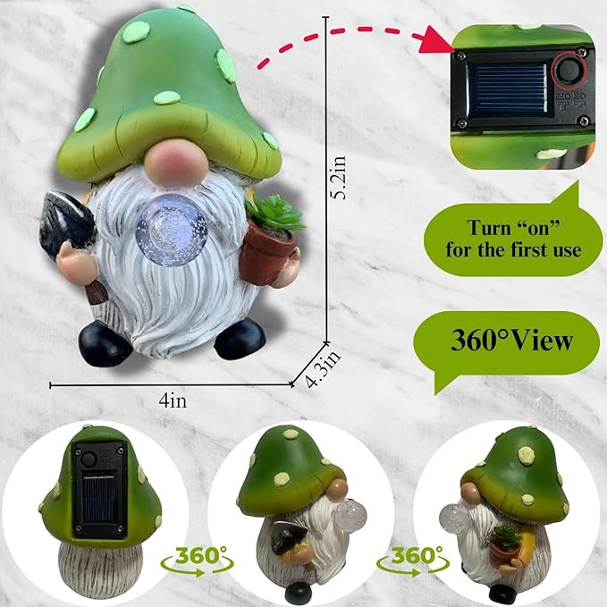 - 【Original Mushroom gnome Design】solar gnome with glowing mushroom holds succulents and a shovel in its hands,symbolizing the hard-working logo of the garden owner.The top of the mushroom is green meaning life and vitality.Mushroom cap absorbs sunlight for 5-hour phosphorescent glow and soft LED lights