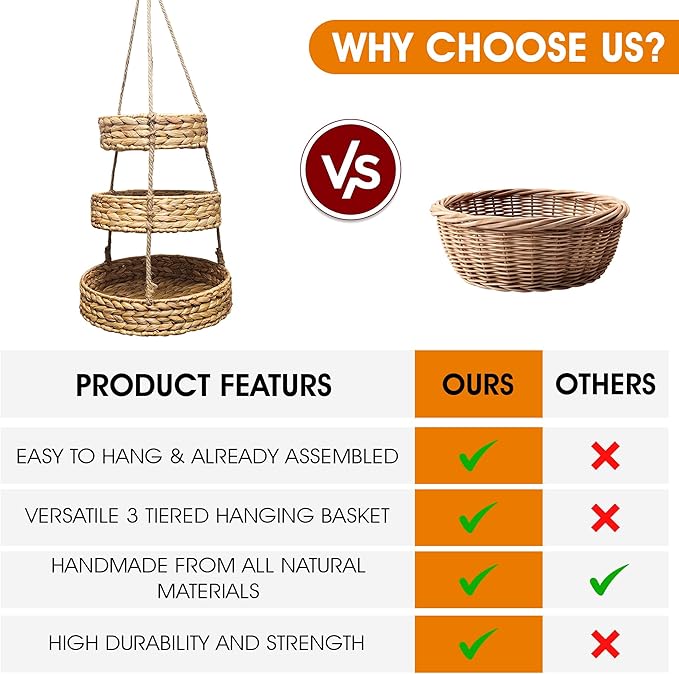 - Versatile Hanging Basket: Set of 3 woven baskets designed for hanging storage of fruits, vegetables, kitchen supplies, and more.