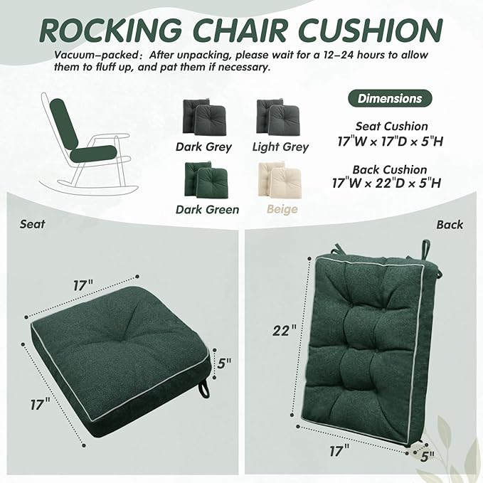 - Ergonomic Design with Thick Cushions:Our rocking chair cushions feature a seat size of 17x17x5 inches and a backrest size of 22x17x5 inches, designed with ergonomics in mind. The 5-inch thickness provides unparalleled comfort, perfectly contouring to your body and effectively relieving pressure