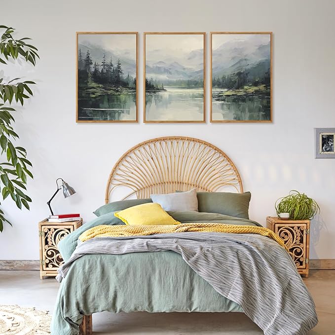 - Emerald Green Mountain Lake Landscape Wall Decor-- Aurlan mountain lake canvas artwork is a 3-piece wall art of a peaceful nature landscape. The overall tone of the painting is soft, capable of evoking feelings of relaxation and pleasure in people.