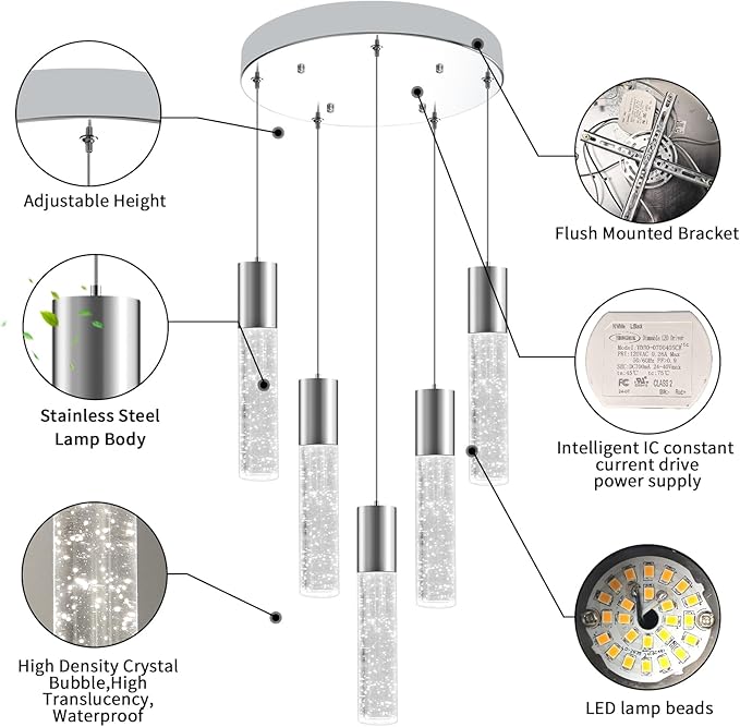 - 【Sleek & Modern Design】Elevate your space with this modern pendant light, featuring electro-chrome steel accents and cylindrical crystal bubble detailing. Designed to infuse luxury and artistry into your home, it transforms your kitchen island into a sophisticated focal point.