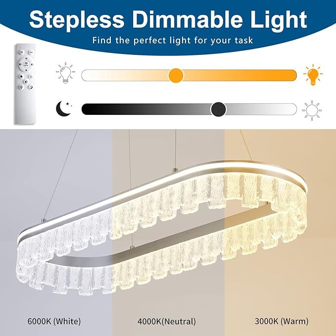 - Dimmable LED Modern Chandelier: This modern LED linear light fixture adopts dimmable LED strip technology and is equipped with a remote control. You can freely adjust the brightness and color temperature of the light using the remote control. Dimming range: 5%-100%.But it does not support any dimmer switches, please do not use wall dimmer switches.