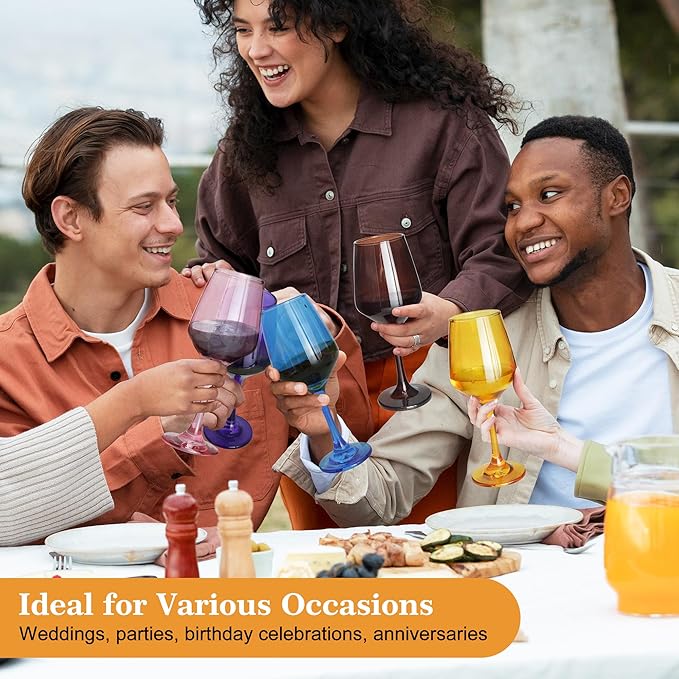 - 【Stable Base to Prevent Spills and Tipping】The stable base of Glazvia colored wine glassware ensures they won’t tip over easily.This thoughtful design of the multicolor wine glasses provides stability, reducing the risk of spills and making these wine glasses a practical choice for parties, gatherings, or formal events. Whether you're hosting a dinner party or just relaxing at home, this colored wine glass set give you peace of mind while enhancing your wine experience.