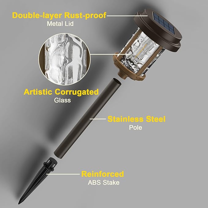 - Premium Durable Construction: Solar lights outdoor with upgraded materials ensure longevity: Rust-proof powder coating metal lid, stainless steel pole, and impact-resistant ABS spikes penetrate hard soil. Artistic corrugated glass makes these sidewalk lights solar powered both functional and decorative.