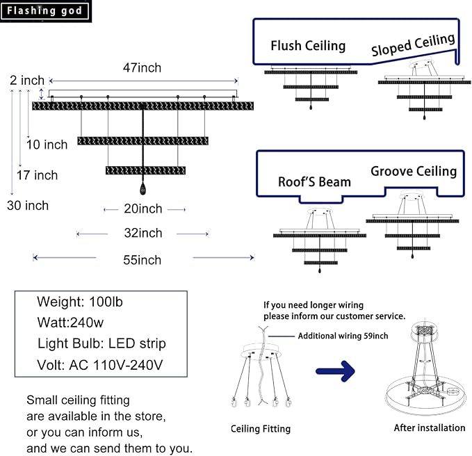 - 【Modern Led Crystal Ceiling Chandelier Size】 Specification: Ceiling pan:47inch,Chandeliers body size:Dia 55inch,H 30inch,Weight:100lb