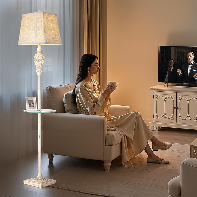 - STURDY GLASS TRAY: The farmhouse standing lamp comes with a 12" tray table made of tempered glass. The tray is 27.5" above the floor and can be used as a nightstand. You can place your phone, book, coffee mug, frame or other things on the tray.