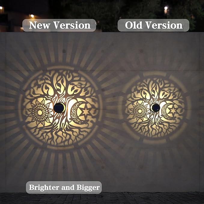 - Good Decoration: 18 lumens of warm yellow light. The large fence solar lights can project a unique and beautiful tree of life pattern. In a dim environment, the solar lights can illuminate a corner of the fence or the wall and create a beautiful and warm atmosphere. They are very suitable as holiday decorations and gifts for relatives and friends.